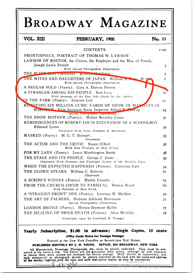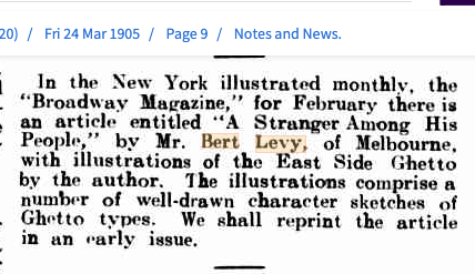 Reverting to a familiar ‘byline’, Bert secures a major piece in a New York monthly magazine..including photos, sketches and an extensive written piece of his first impressions of the Jewish way of life in America in 1904/05. Broadway Magazine was an illustrated magazine covering New York theater and culture from the 1898.