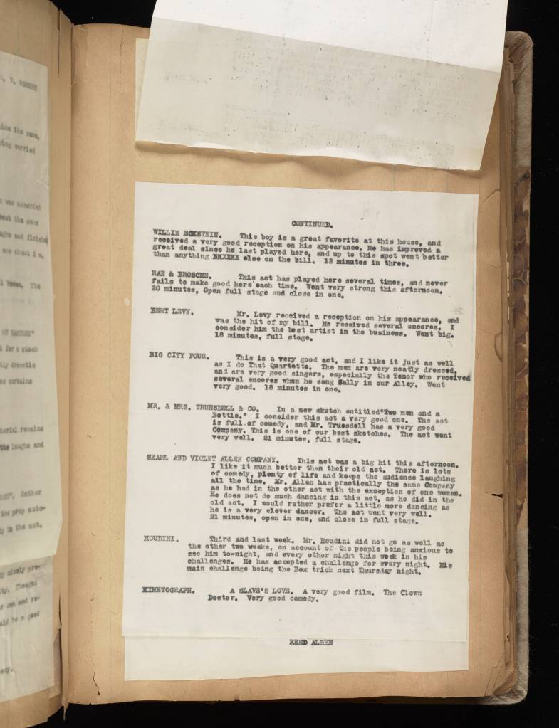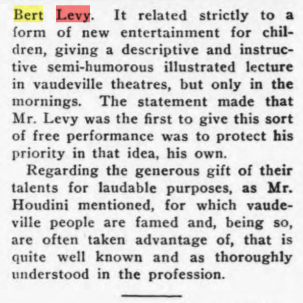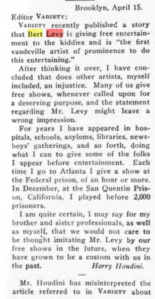 Variety Magazine April 1916Variety magazine responded to Harry’s letter Bert and Harry Houdini often appeared on the same Vaudeville bill as far back as 1907. Keith’s was one of the largest Vaudeville Theatre chains in the USA. Below is the Theatre Managers review of performances in the week of June 17 1907 at Keith’s Union Square Theatre, New York.