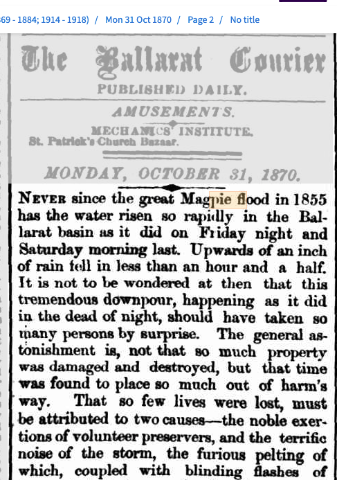 Bert’s older sister Sarah (born in 1869) would have been that baby in the cradle that went sailing around the floor of the bedroom. The flood was certainly bad as we read in The Ballarat Courier’s report.