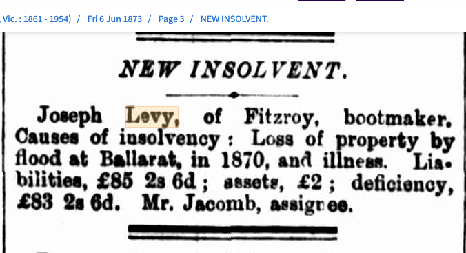 One final reference to Bert’s birth place. The Levy family were certainly in Ballarat in 1870 and may have likely been there for at least a couple of years. Prior to Bert’s birth in 1871 his parent’s new boot making business possibly had a perilous beginning. The first reference to Simon Levy (Bert’s father) in the Ballarat newspapers is a reference to the Geelong Insolvent’s Court in May 1870 when he and a number of other Ballarat business people are mentioned.