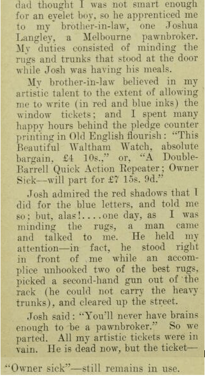 In the Lone Hand Magazine article of 1912 again, Bert continues his description of his early career missteps. His second job as a pawn broker (probably around the age of 16 -17 ?) was a little more colourful than an eyelet machine, however it ended pretty much the same way. Joshua Langley had married Bert’s older sister Matilda and the Pawn shop was in Bourke Street.