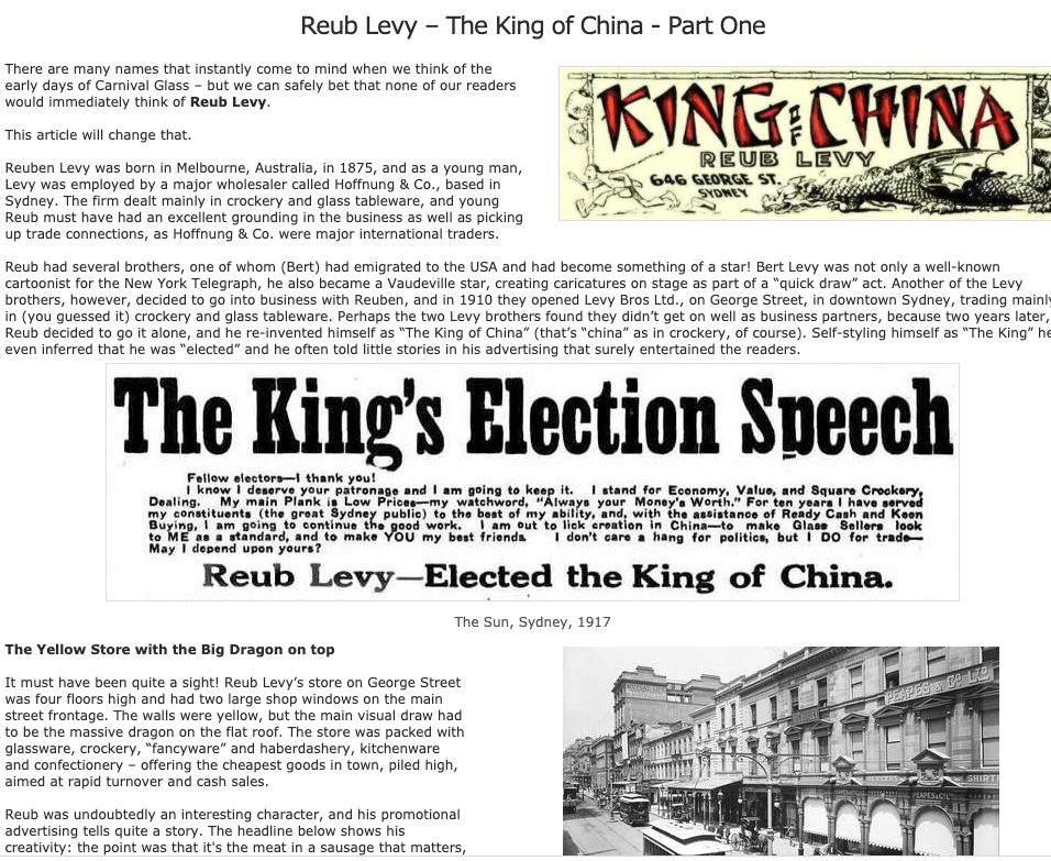 The following comes from a USA web site dedicated to ‘Carnival Glass Worldwide’ and dedicates two pages to Reuben’s business in George Street, Sydney.