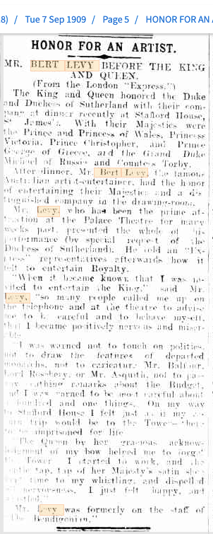 Sydney MailEvening Mail Sydney. Bert was summoned to appear before the Royals at Stafford House, St. James London at the time belonging to the Duke of Sutherland. The palace is now known as Lancaster House, after it was purchased by Sir William Lever (wealthy soap maker) and given to the state. The building now houses the Government Wine Cellar. In 1900 the Duke of Sutherland owned about 1,358,000 acres (550,000 hectares) and the steam yacht Catania, which was chartered by some of the super-rich of that era. The Duke died at Dunrobin Castle, Sutherland, on 27 June 1913, aged 61, and was buried at Dunrobin. https://en.wikipedia.org/wiki/Cromartie_Sutherland-Leveson-Gower,_4th_Duke_of_Sutherland