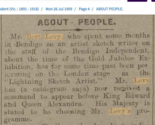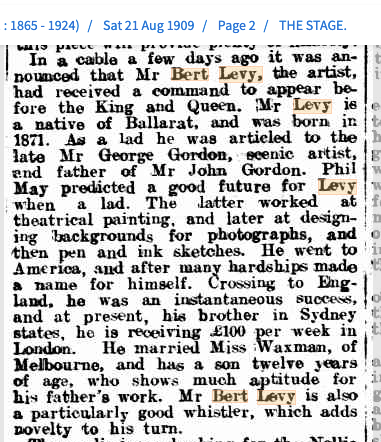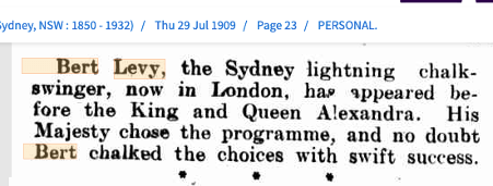 When news was received that Bert was to entertain the Royals in London this all changed. It seemed newspapers were now very happy to claim association with the smart young Jew who left Australia’s shores in May 1904. Here are just a few –