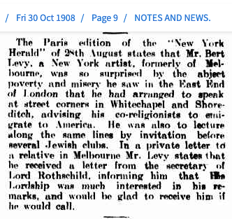 Background: Obviously, living conditions in 1908 had not greatly improved from the time Bert’s parents and elder siblings lived in the London East End before immigrating to Australia. Simon and Mina Levy were living in Spitalfields, the notorious White Chapel hamlet in the 1850s and 60’s. The area had evolved into classic “Dickensian” London, with problems of poverty and overcrowding with warrens of small dark streets housing great suffering, filth and danger. For those families seeking a better life out of the London east end, the bulk would have headed to the United States with a small but steady number undertook the 3-4 month perilous voyage across the world to Australia.