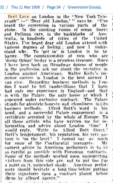 Alfred Butt managed the Palace for 14 years from 1904. He went on to much bigger things… This was the guy that first engaged Bert in 1908 when Bert turned up unannounced.