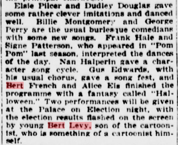 Below we read that on the night of the November 1916 Presidential election Alwyn (age 18) was to use Bert’s projection device to flash the election results at the Place Theatre, NYC. It is also appears Alwyn was following in his father’s footsteps as a cartoonist. Woodrow Wilson (Democrats) won that election by the way.