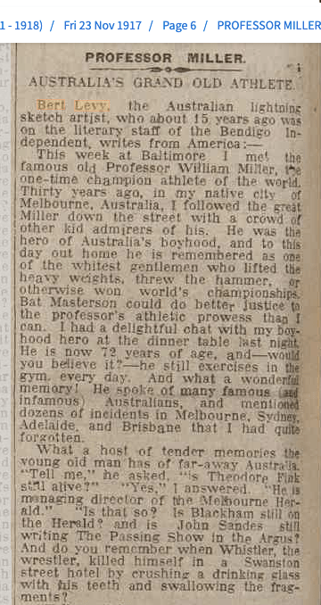 Professor William Miller was the only athlete to hold Australian championships for boxing, fencing, wrestling and weight-lifting. Miller became proprietor of the Melbourne Gymnasium, and instructor to some the leading Melbourne schools. Miller went to America in 1903 and became a Physical Education Instructor for the New York Police Department.