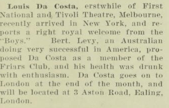 Bert proposes Louis Da Costa (Sydney Vaudeville agent and early Australian Film producer) for membership of the Friars Club in 1923.